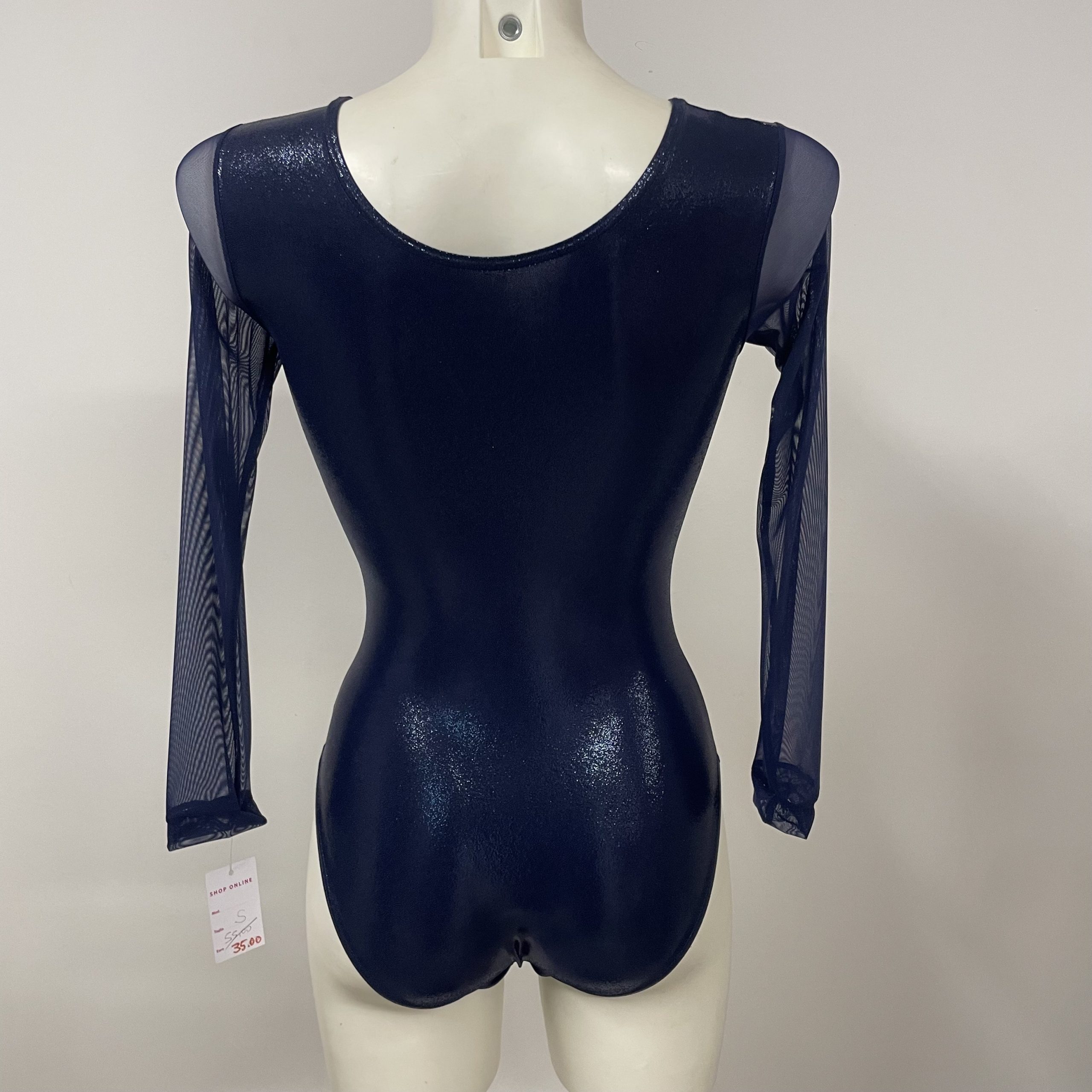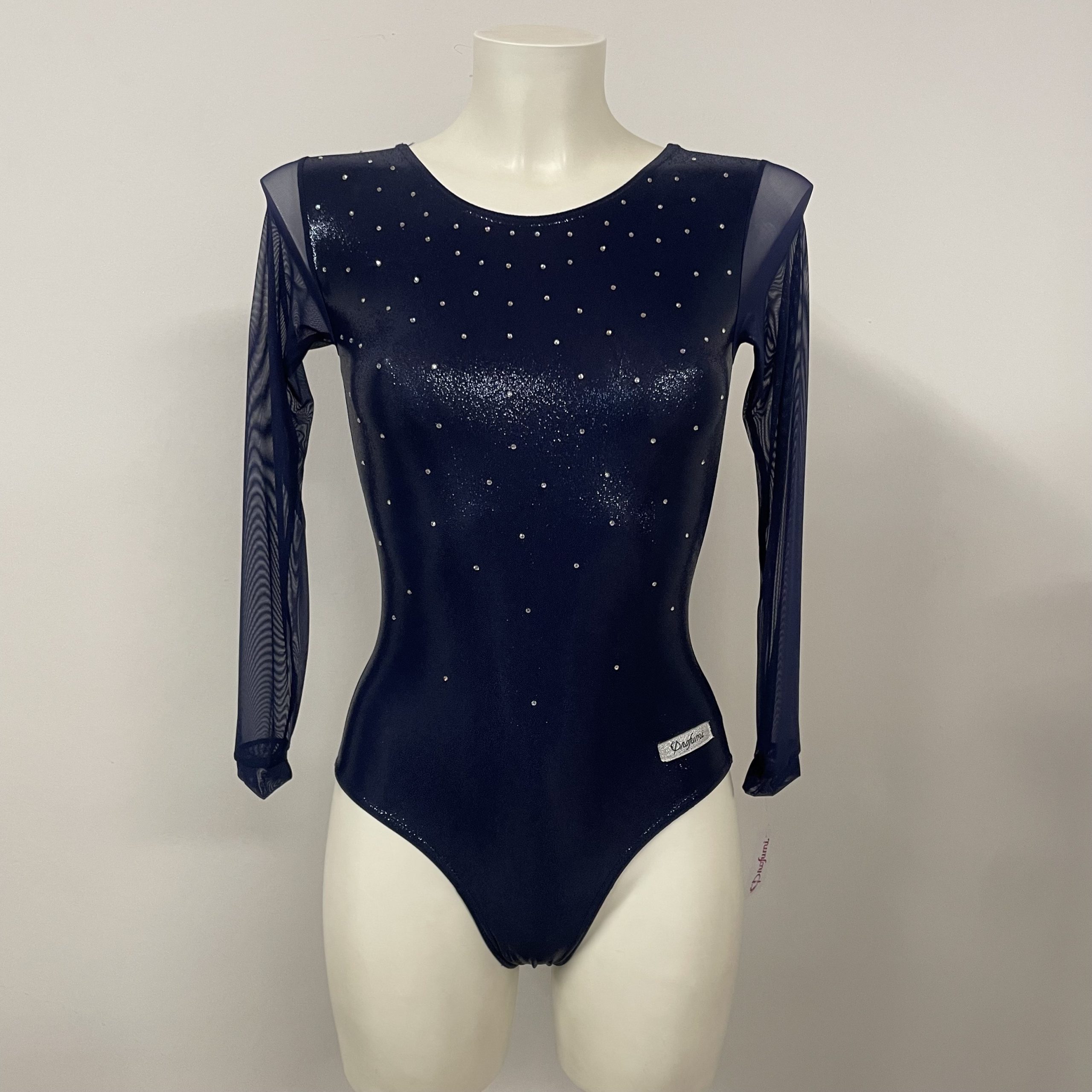 Body ginnastica artistica con strass forma 8, LG109 blu con manica lunga velo blu.