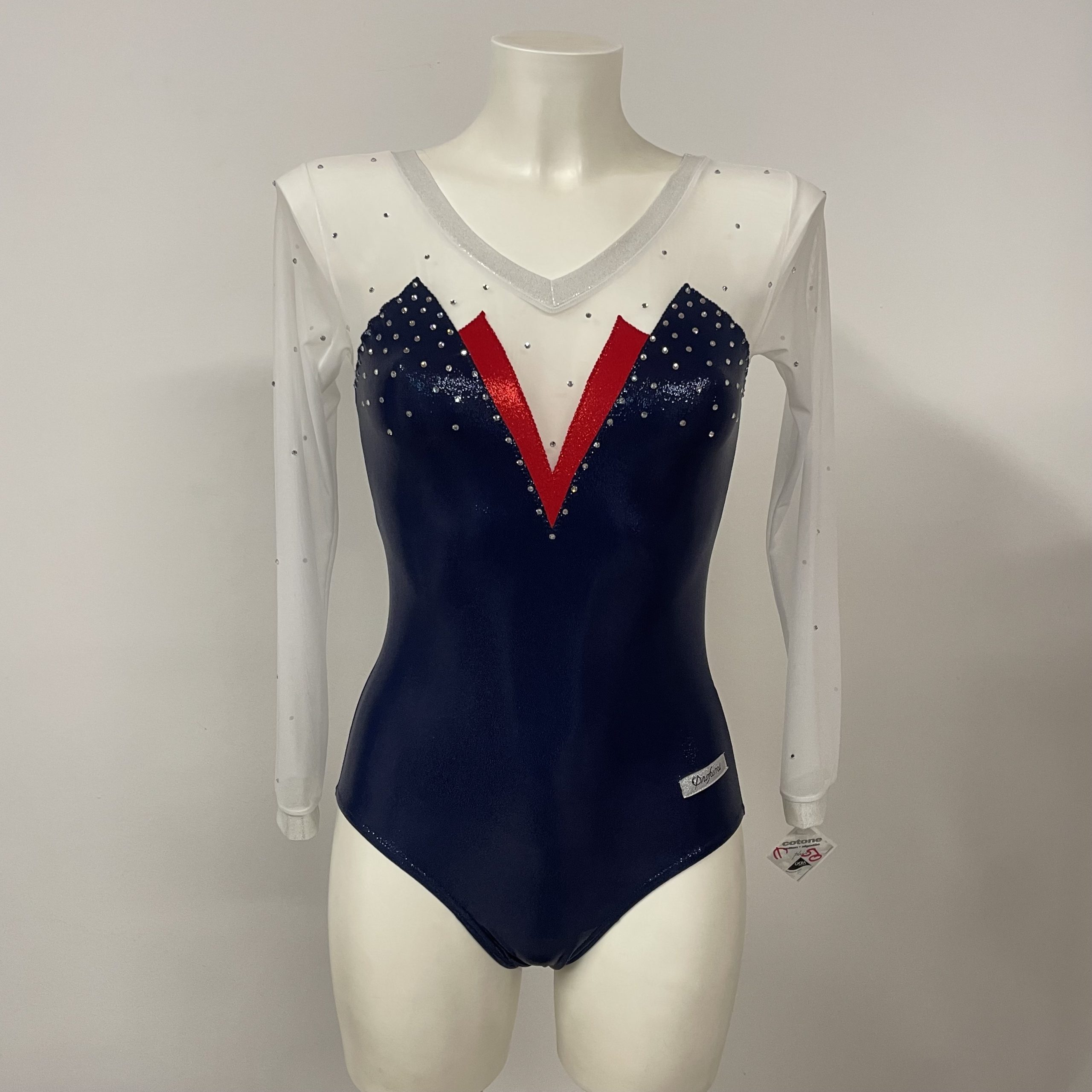 Body ginnastica artistica manica lunga collo CV con strass, LG 109 blu, LG 176 rosso, velo bianco, LG 751 bianco.