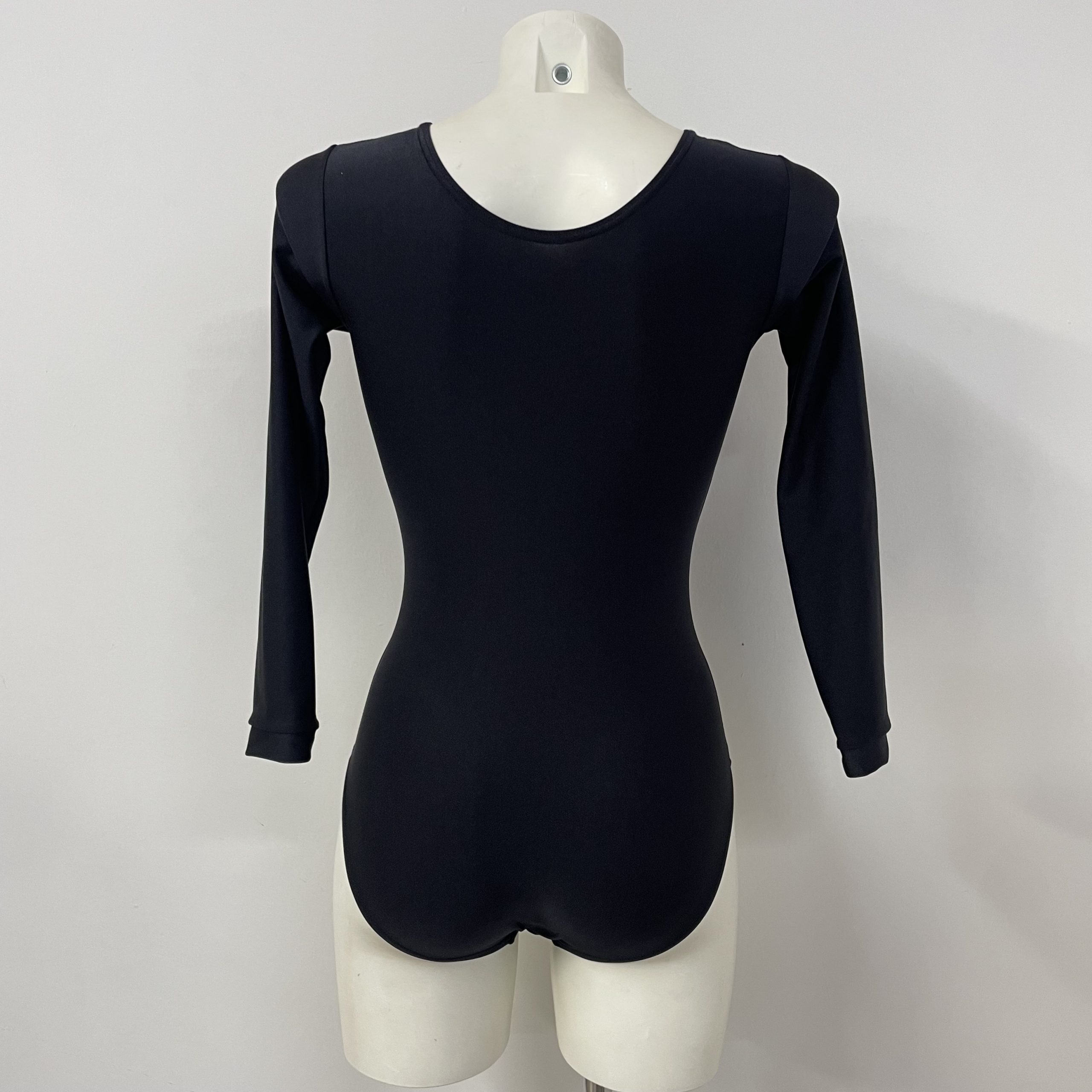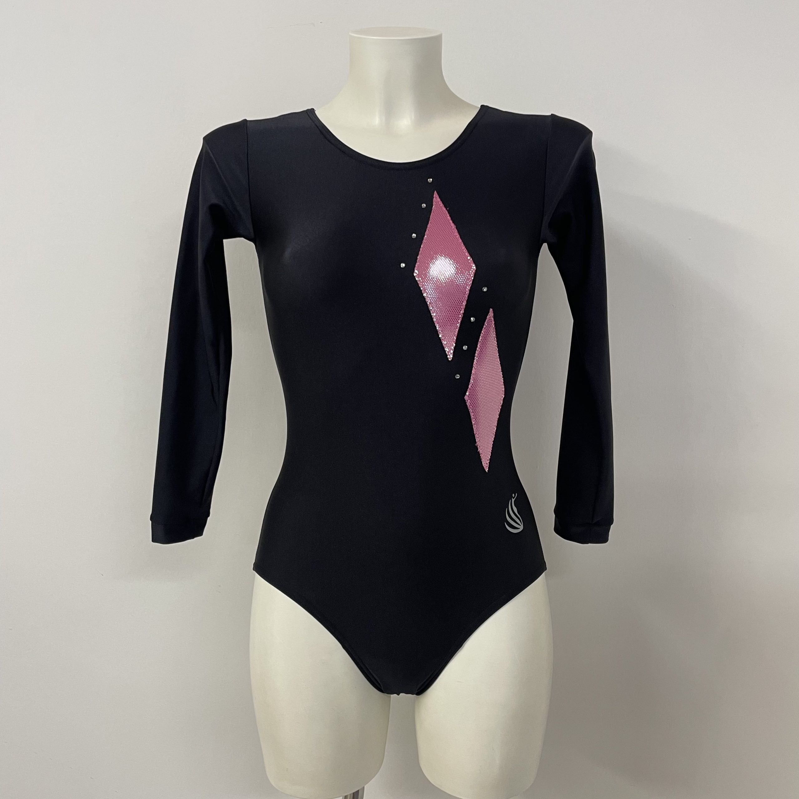 Body ginnastica artistica a manica lunga modello 34 in lycra 12 nera e applicazione lurex 394 rosa e strass.