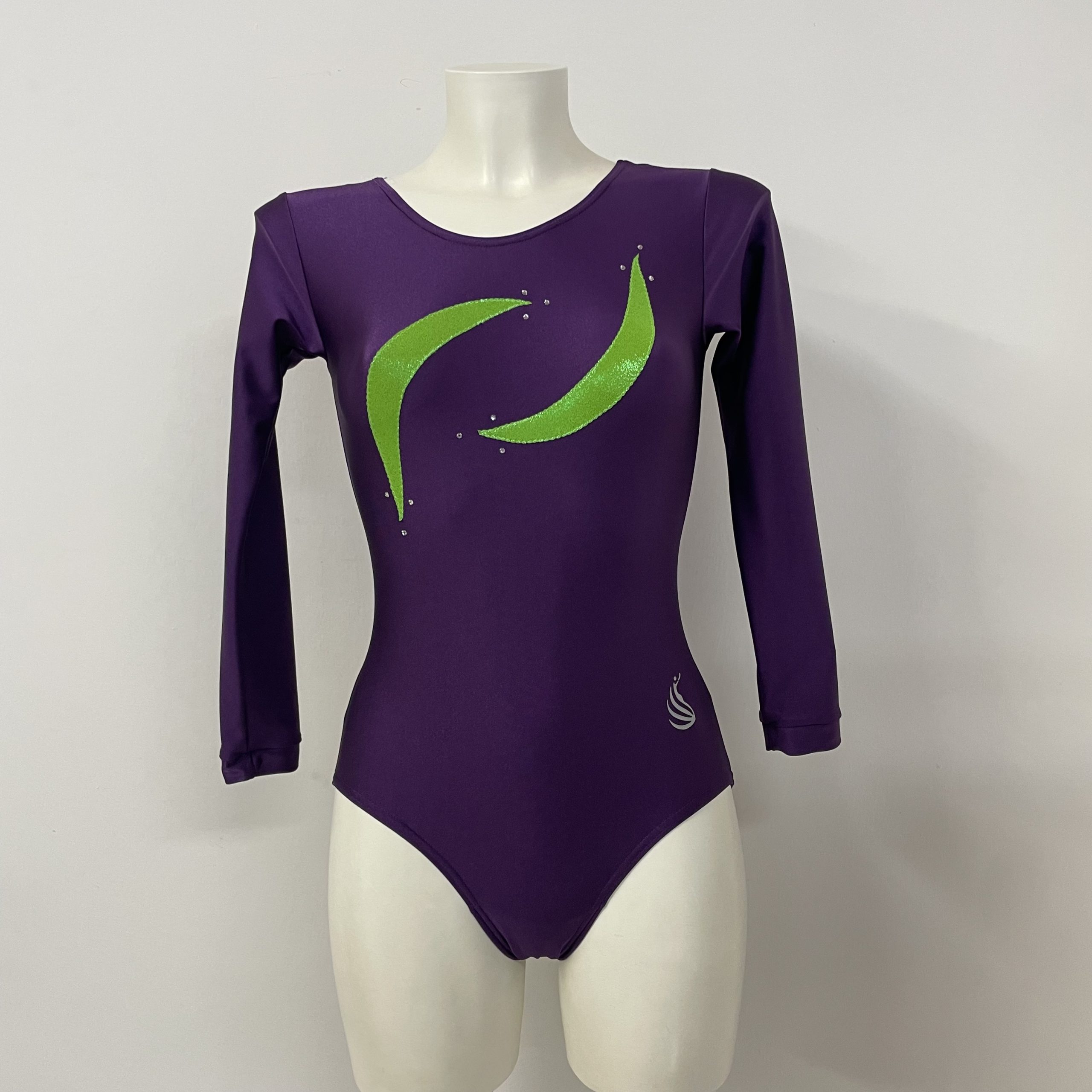 Body ginnastica artistica mod.35 in lycra 125 prugna, applicazioni verde fluo e strass.