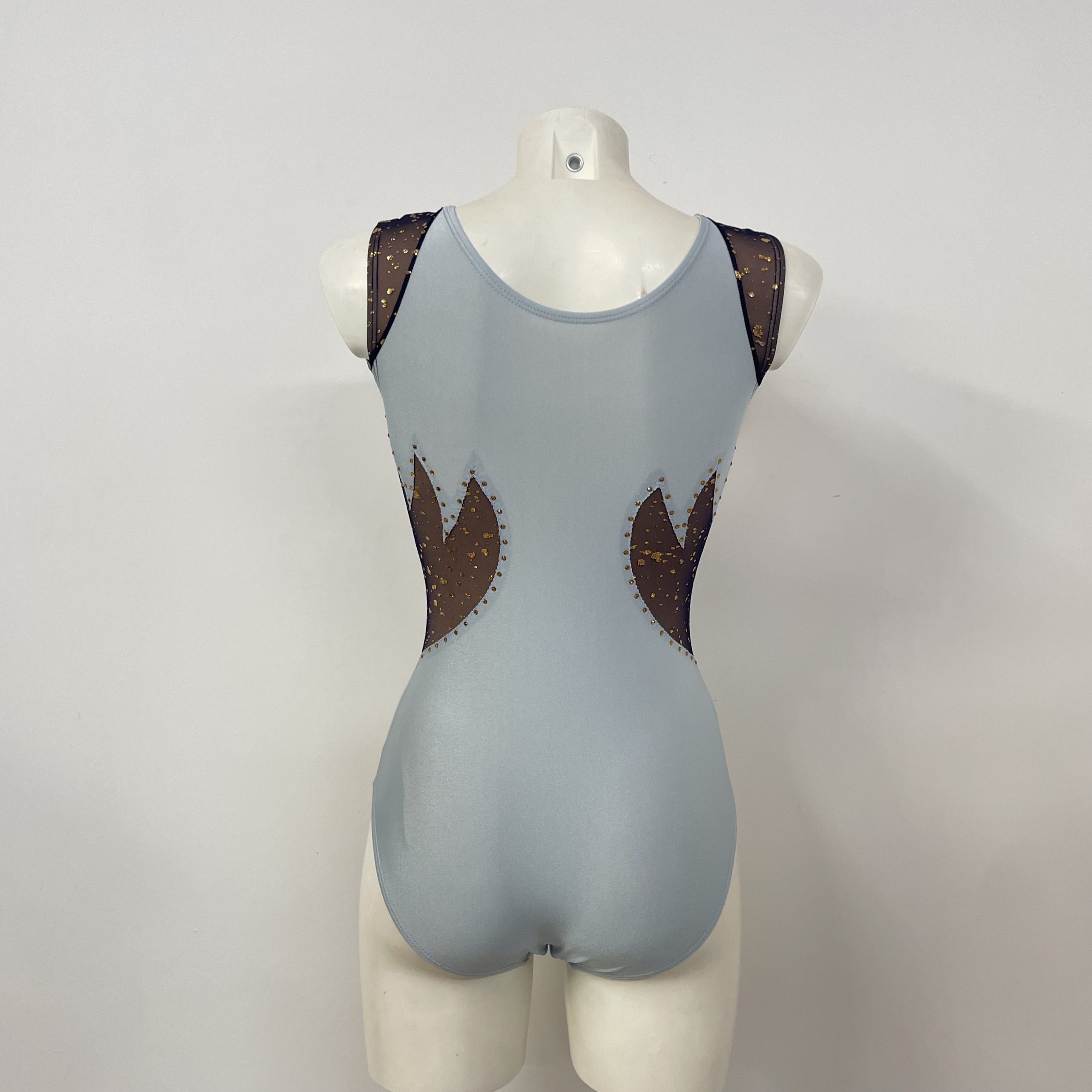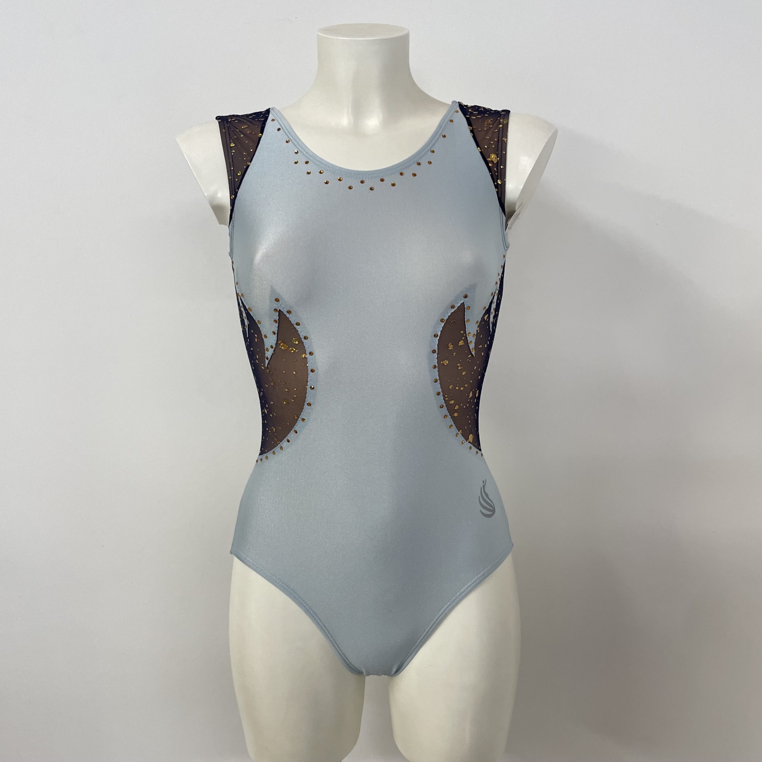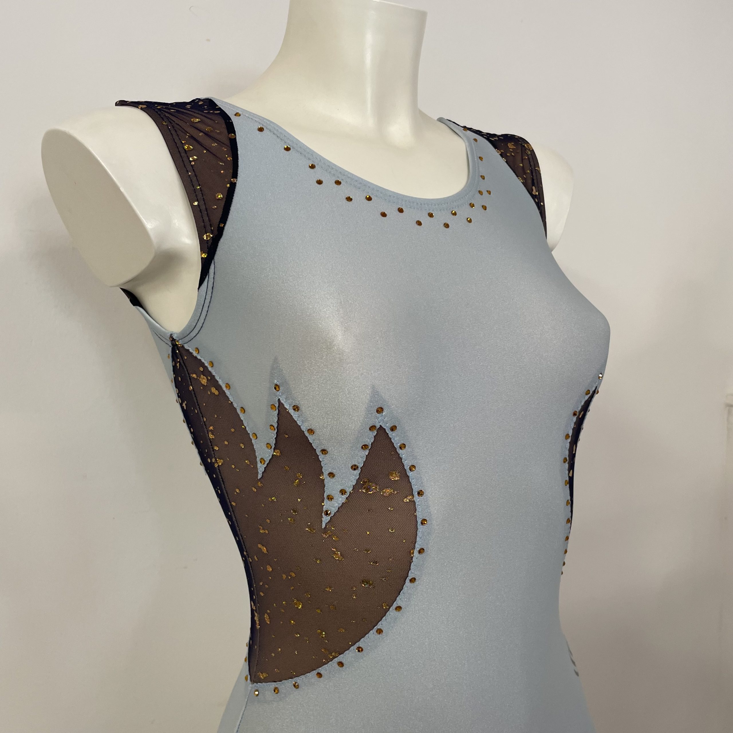 Body da ginnastica artistica, modello F446 in lycra celestino e velo lurex blu con lamina oro. Strass fino a 100, foderato.