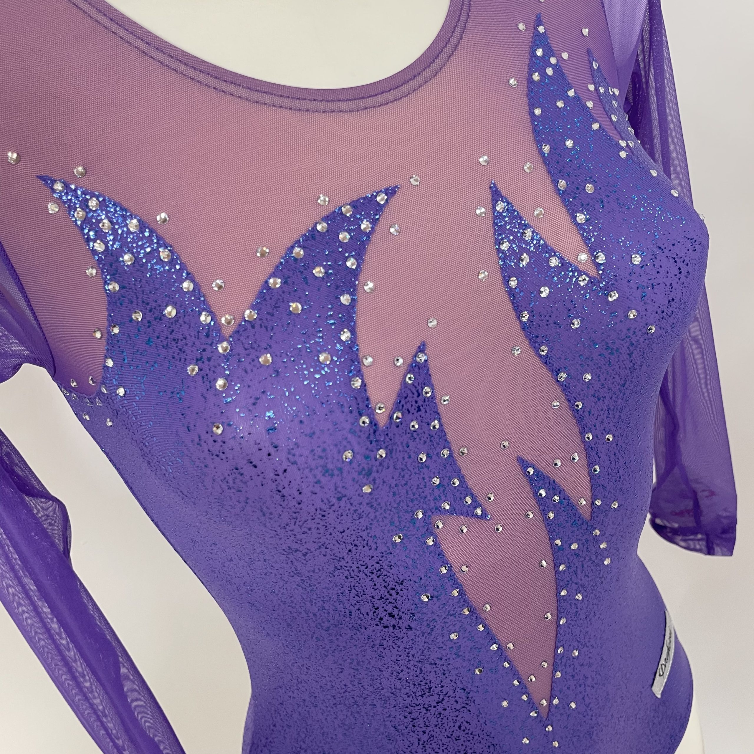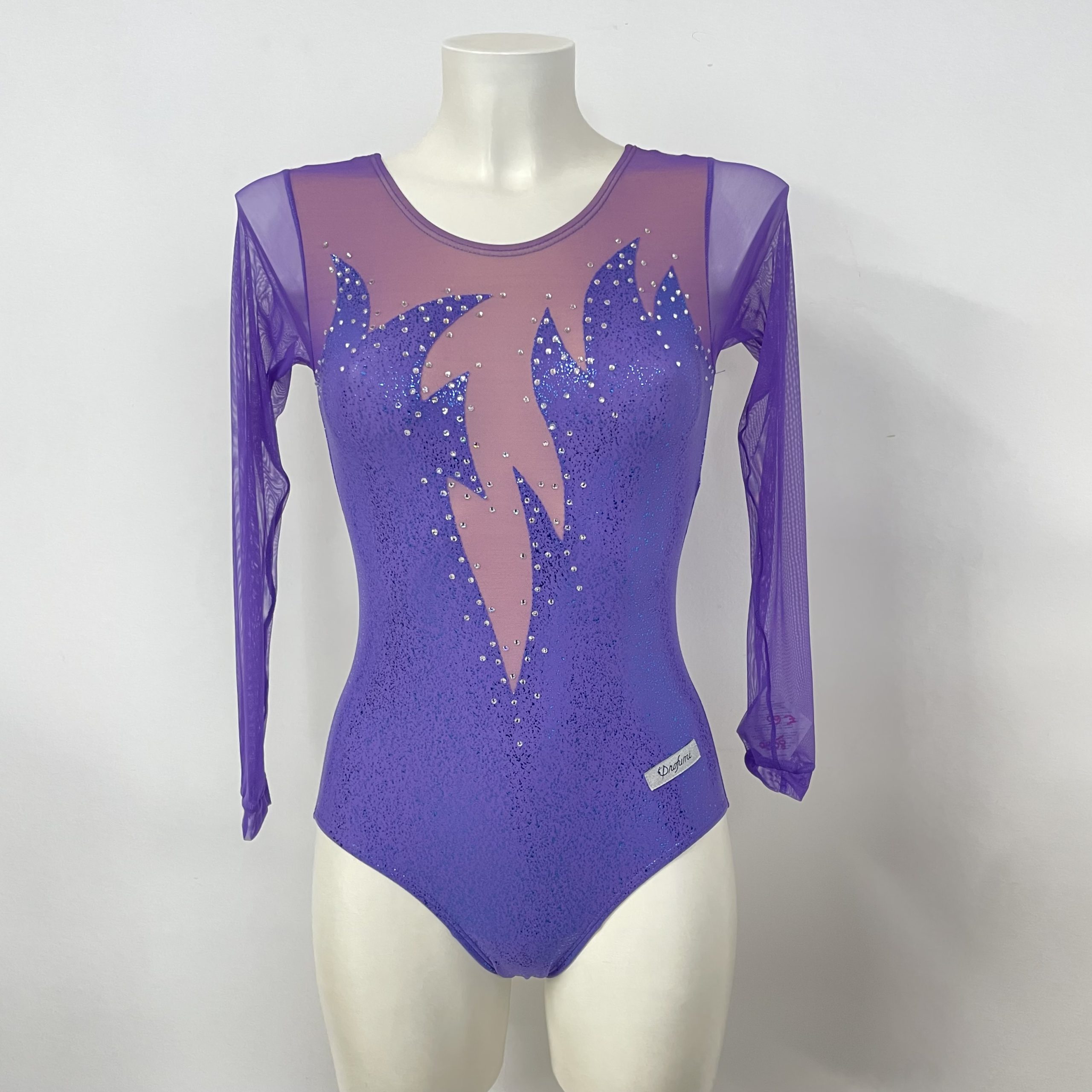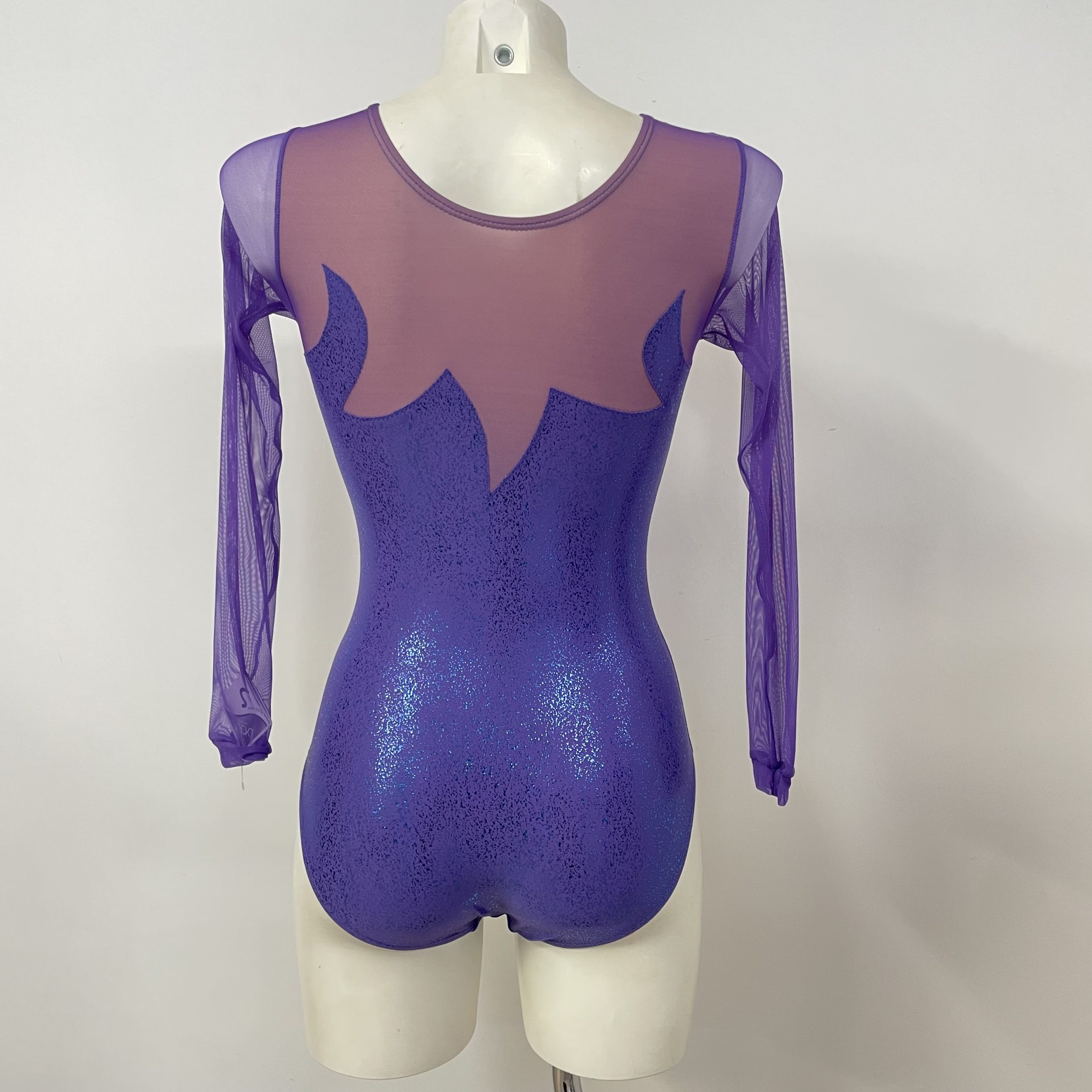 Body ginnastica artistica manica lunga, MOD. D537 in lurex 933 viola e velo viola foderato.